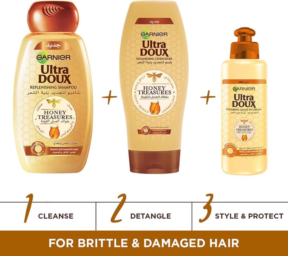 بلسم تجديد للشعر الهش والتالف، مع غذاء ملكات النحل والعسل والبروبوليس، للحصول على تغذية وحماية وأطراف إصلاح أفضل، يصبح الشعر أقوى وأكثر لمعانًا وأسهل في التصفيف. كيفية الاستخدام: بعد غسل الشعر بالشامبو، ضعيه على الشعر حتى الأطراف ودلكي بعناية. اتركه يعمل للحظة ثم اشطفه. المكونات: تقدم لك جارنيير Ultra Doux وصفة تجديد جديدة مصممة خصيصًا للشعر الهش والتالف. يجمع بين ثلاث فوائد رائعة من خلية النحل: غذاء ملكات النحل المجدد، إكسير منشط معروف بتقوية الشعر من جذوره؛ دنج واقي، أسمنت طبيعي، مصنوع من النحل، معروف بقدرته الوقائية؛ عسل مغذي، رحيق معروف بفوائده المنعشة والتغذية.